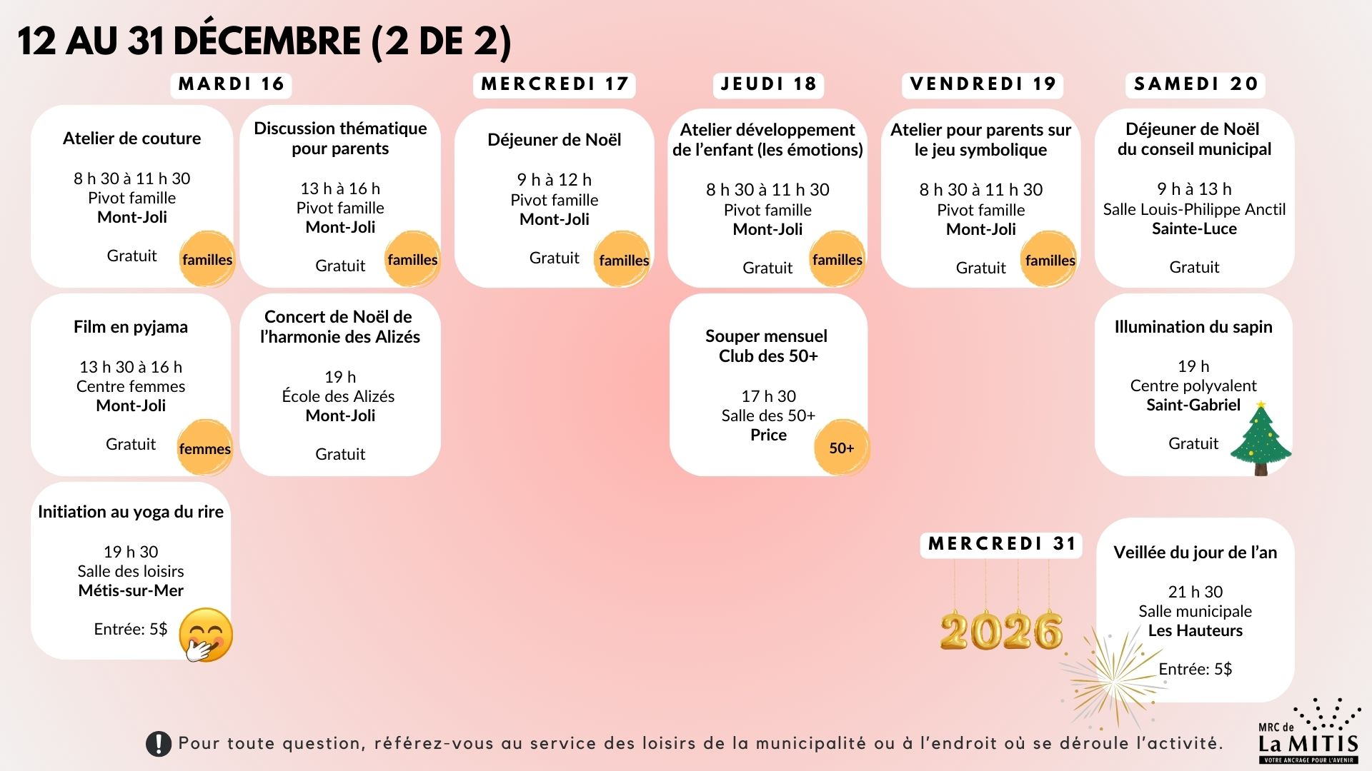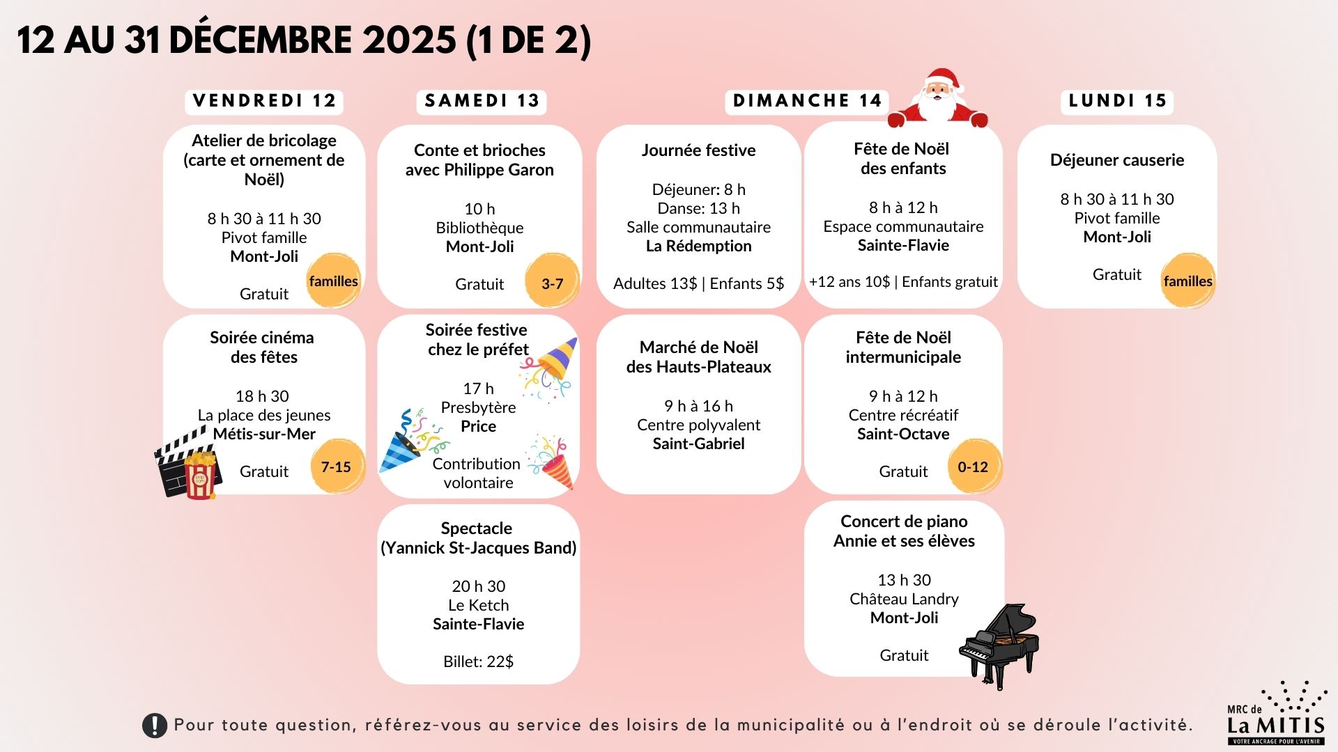 Calendrier des activités – Décembre 2025